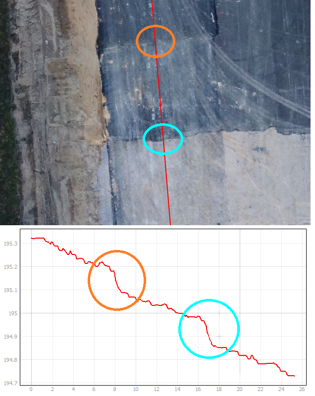 Wynikowe objętości należało dodatkowo skorygować o częściowo wybudowane warstwy konstrukcyjne (podbudowa, asfalt itd.), których grubości zostały przyjęte z danych projektowych. Początkowo mieliśmy obawy, czy na podstawie samych zdjęć uda nam się stwierdzić ilość warstw wylanego asfaltu – okazało się to możliwe dzięki precyzyjnym modelom terenu, które dokładnie zobrazowują “schodki” na końcach poszczególnych warstw: