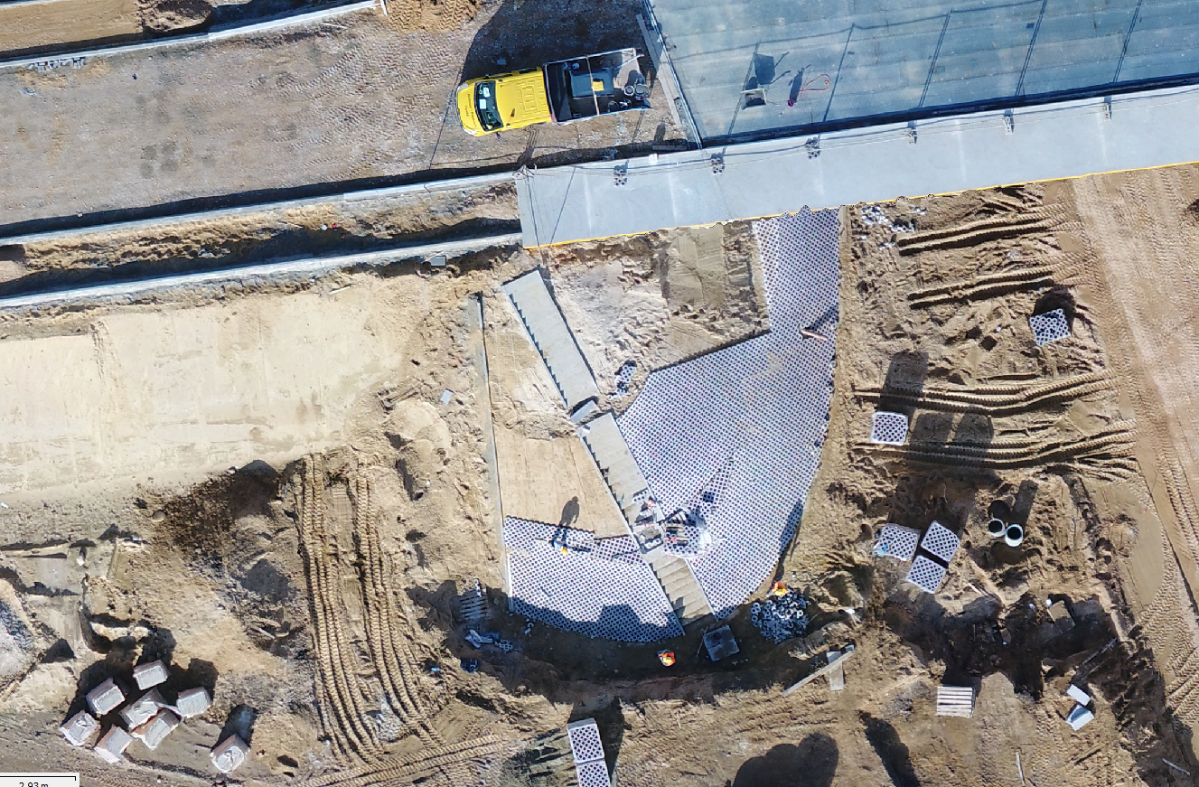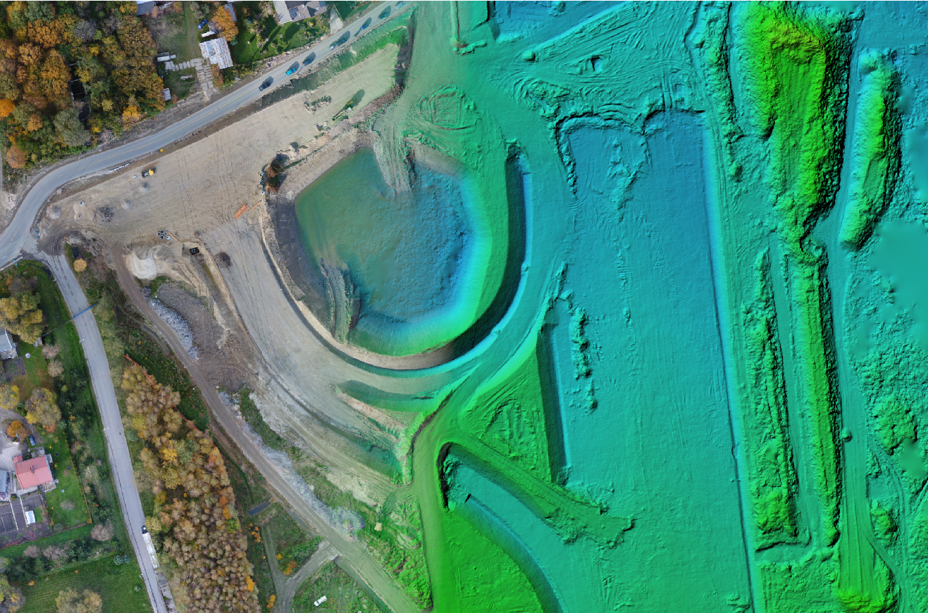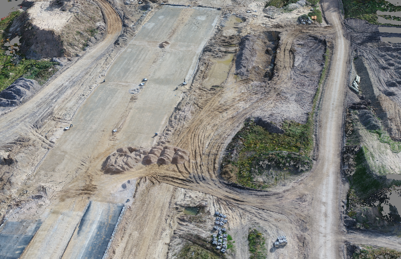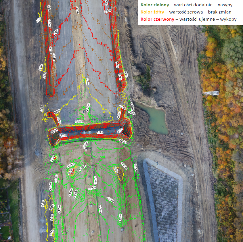 Na podstawie zdjęć opracowaliśmy ortofotomapę o rozdzielczości 2cm/piksel oraz NMT (Numeryczny Model Terenu) o dokładności wysokościowej <5cm. Produkty te, wraz z otrzymanym od Zamawiającego modelem stanu "zerowego" (opracowanego przed rozpoczęciem budowy) posłużyły do wykonania obliczeń objętości wykonanych nasypów i wykopów.