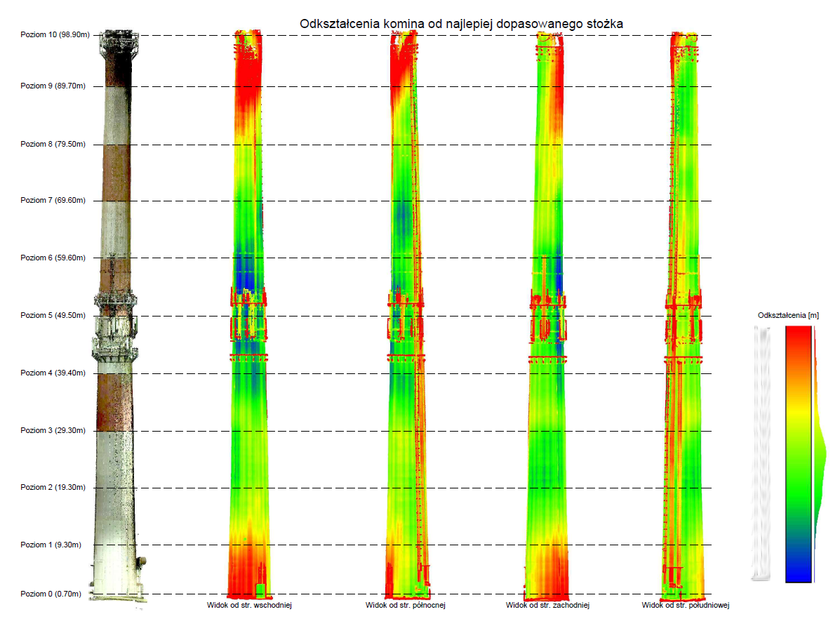 Skaning laserowy daje o wiele szersze możliwości prowadzenia dodatkowych analiz, względem klasycznych metod pomiarowych. Oprócz standardowych wykresów odchyleń osi komina, obliczyliśmy odległość każdego punktu chmury punktów od stożka aproksymującego idealny kształt komina. Na barwnych ilustracjach tych odkształceń, wyraźnie widać gdzie występują największe deformacje – informacja ta może zostać wykorzystana m.in. przy dalszych pracach inspekcyjnych.
