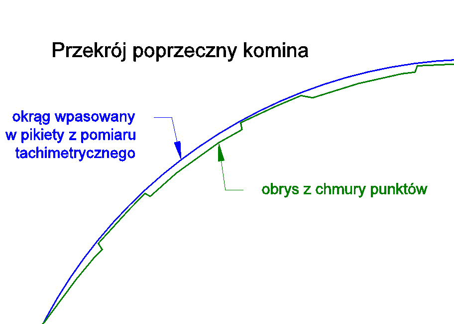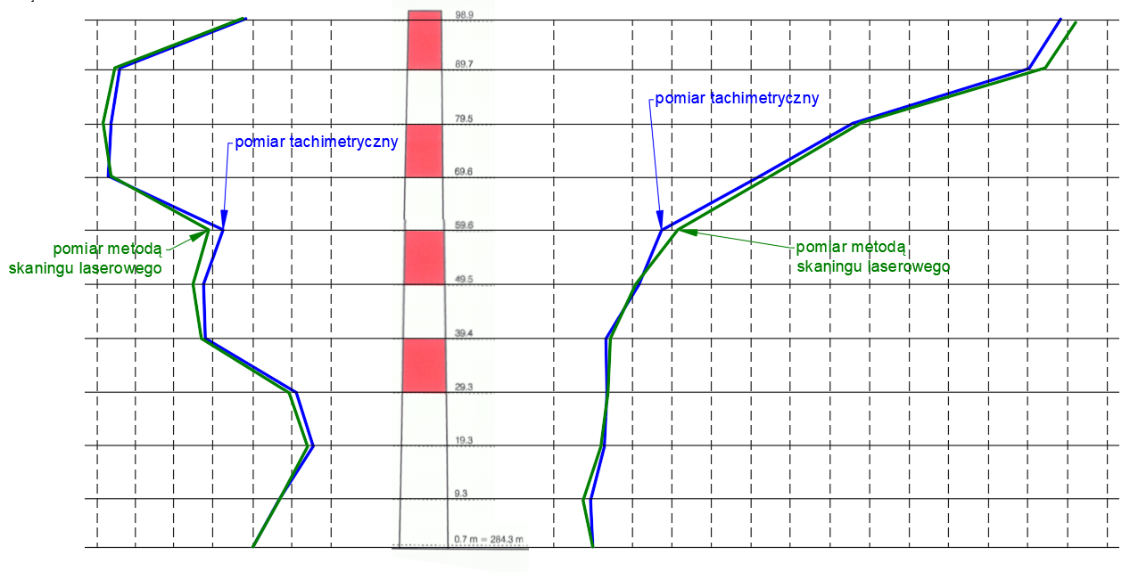 Chmura punktów, pozyskana w wyniku skanowania laserowego miała kilkucentymetrową gęstość (odległość między sąsiednimi punktami chmury) nawet w wysokich partiach komina. Na wybranych poziomach pomiarowych wykonano na jej podstawie precyzyjne poziome przekroje konstrukcji, których środki ciężkości uznano za położenie osi komina.