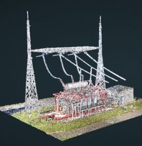 Fragment chmury punktów obrazującej infrastrukturę stacji elektroenergetycznej.