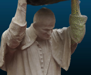Chmura punktów pozyskana z wykorzystaniem fotogrametrii bliskiego zasięgu obejmująca figurę Jana Pawła II będącą fragmentem instalacji “Zatrute Źródło” wystawionej 24.09.2020r. przed Muzeum Narodowym w Warszawie.