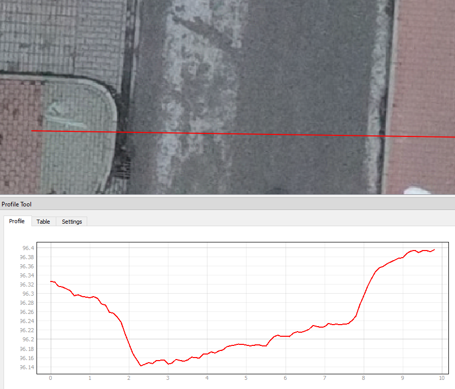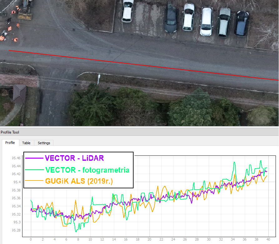 Archiwalne dane GUGiK (z 2019r.) były zgodne z aktualnymi danymi LiDAR, za wyjątkiem miejsc, w których zdążyły się zdezaktualizować (np. nowowybudowana wysepka na przejściu dla pieszych). Aktualne dane LiDAR charakteryzują się najmniejszym szumem, co wynika nie tylko z dokładności sensora ale też zaawansowanych metod przetwarzania chmur punktów. Metoda fotogrametryczna w tym przypadku cechowała się dokładnością ok. +/- 5cm, co wynikało z trudnych warunków pogodowo-oświetleniowych, niemniej jednak sprawdziła się jako materiał kontrolny. Warto przypomnieć, że fotogrametria nie pozwala na zamodelowanie poziomu terenu na obszarach pokrytych jakąkolwiek roślinnością (w przeciwieństwie do LiDAR).