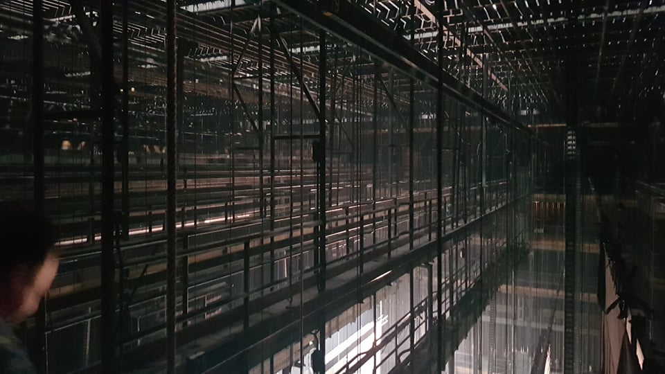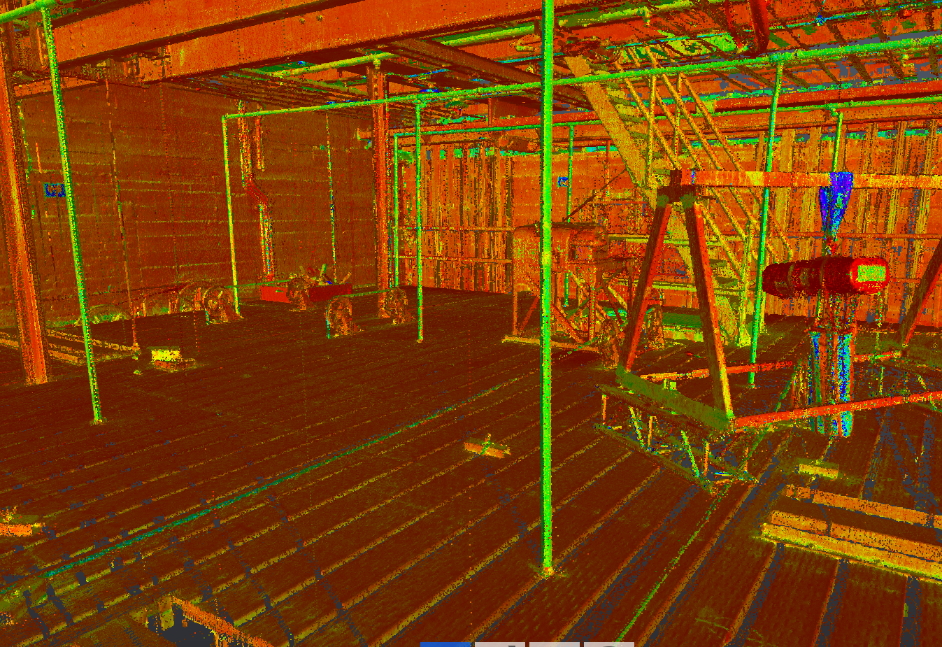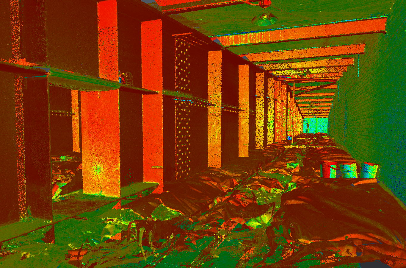 Strop nad sceną główną składa się z dwóch poziomów – stropu technicznego, na którym znajdują się setki/tysiące linek, wciągarek, silników i innych urządzeń służących do obsługi elementów scenografii wiszących nad sceną (głośniki, oświetlenie, kurtyny itd.), oraz strychu. Konstrukcja liczy sobie już ponad 60 lat – nasze prace miały za zadanie zobrazować ewentualne odkształcenia elementów od ich projektowanych/nominalnych kształtów. Na obydwu tych poziomach pozyskano łącznie dane z ok. 120 stanowisk skanera laserowego w ciągu 2 dni pomiarowych, co pozwoliło zobrazować powierzchnie wszystkich elementów konstrukcji z dokładnością 2mm.