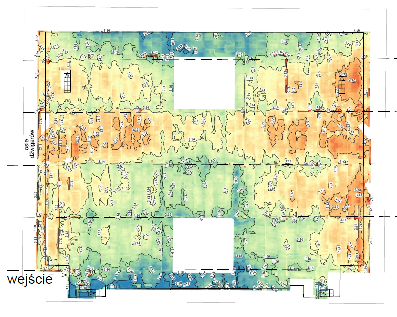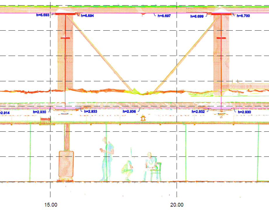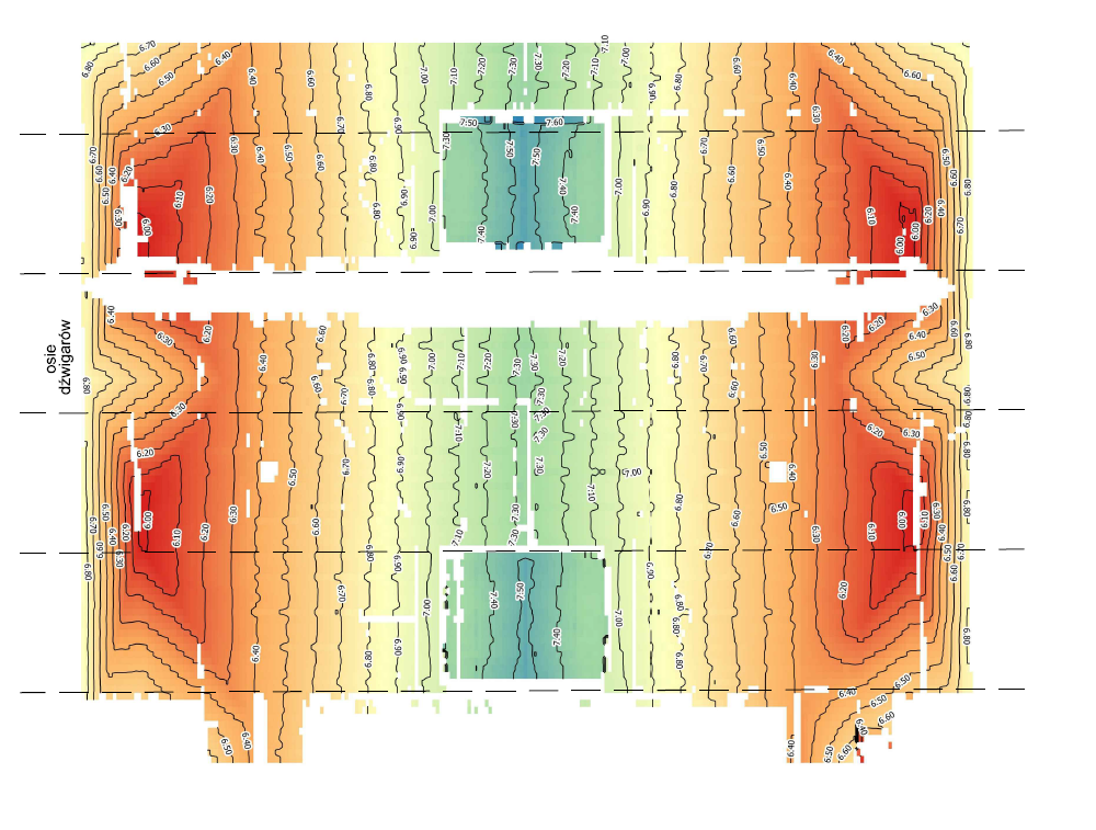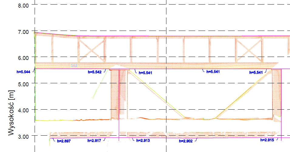 Następnie, chmurę punktów wczytano do oprogramowania CAD i sporządzono kilkanaście przekrojów podłużnych/poprzecznych oraz rzutów XY przedstawiających odkształcenia powierzchniowe powierzchni sufitu/dachu.
