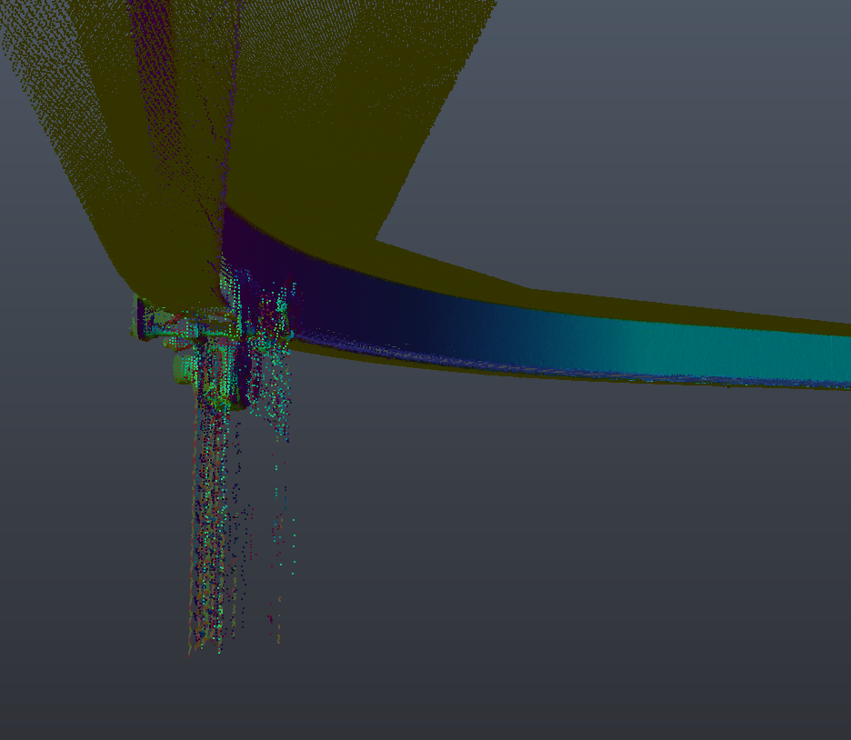 Przy okazji (poza pomiarem torowiska) zarejestrowano 90% instalacji znajdujących się wewnątrz pomieszczenia – “gratisowe” dane w postaci chmury punktów mogą zostać wykorzystane przez zamawiającego do innych, niezwiązanych z przedmiotem naszego opracowania, analiz.