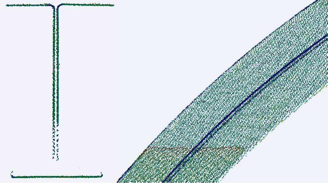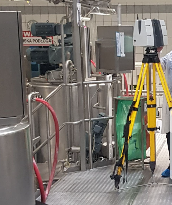 Pomiary wykonaliśmy z wykorzystaniem skanera Leica P50, co umożliwiło zarejestrowanie ciągłych danych o kształcie dwuteowników wygiętych w kształt litery U. Dokładność pomiaru zweryfikowano na kilkaset miarach kontrolnych pozyskanych przy użyciu suwmiarki – różnice rzadko przekraczały 1mm i najczęściej było to spowodowane lokalną chropowatością powierzchni elementów. Z powodu obecności rozmaitych urządzeń linii produkcyjnej, pomiary suwmiarką trzeba było wykonywać z wykorzystaniem zwyżki – warto jednak zauważyć, że nawet z jej pomocą wiele fragmentów torowisk pozostało niedostępnych do wykonania pomiarów metodą inną niż naziemnym skanerem laserowym.